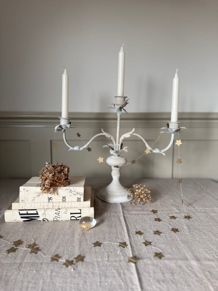 A vintage style candelabra with a verdigris distressed finish, bringing French charm to your home and garden setting.